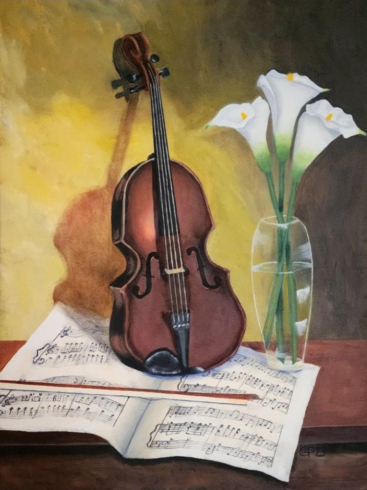 My wife Kristin is a talented musician. She writes, sings, and plays the piano, among other instruments. I wanted to dedicate a painting to her and all that she does to bring joy into the world with her talents. The music on the paper is based on her song, “I Believe in My Savior.” Her favorite flowers are white calla lilies, and I wanted that to represent our love for each other as well.