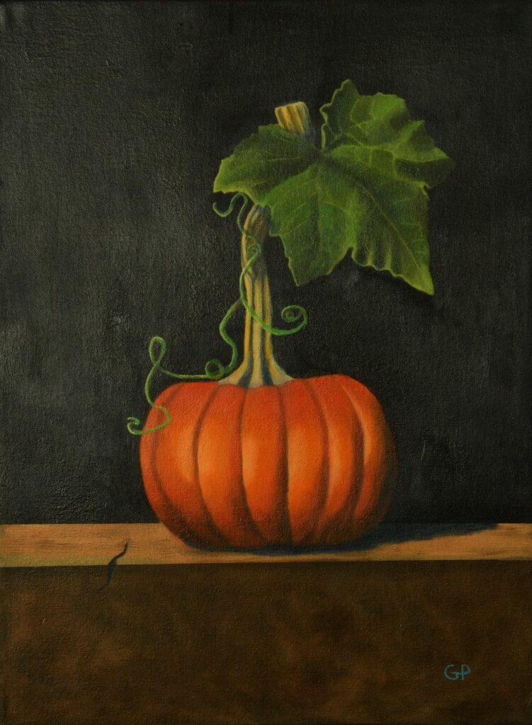 The pumpkin is the first still-life painting I did in the class I am currently attending. I chose a pumpkin because I didn’t want to do a bowl of fruit. Lol.